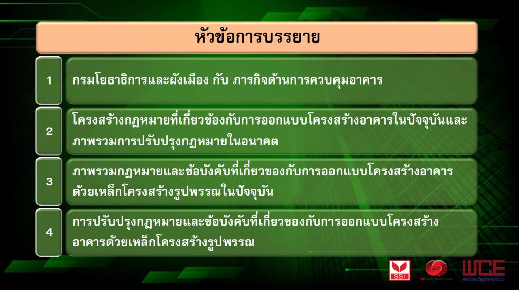 กฎหมายที่เกี่ยวข้องกับเหล็กโครงสร้างรูปพรรณ : หัวข้อการบรรยายหัวข้อนี้ ถือเป็นหนึ่งใน Highlight ของงาน เพราะเป็นการนำเสนอถึงกฎหมาย ซึ่งเป็นข้อบังคับด้านกฎหมายสำหรับวิศวกรผู้ออกแบบ อันประกอบไปด้วยพระราชบัญญัติควบคุมอาคาร (Building Control Act) และกฎกระทรวง (Ministerial Regulation) ซึ่งไม่ใช่รายละเอียดทางเทคนิค อันประกอบไปด้วย ประกาศกระทรวง (Ministry Announcement) และมาตรฐานอ้างอิงสำหรับการออกแบบ (Standard) ซึ่งผู้ออกแบบสามารถเลือกตามความเหมาะสมได้