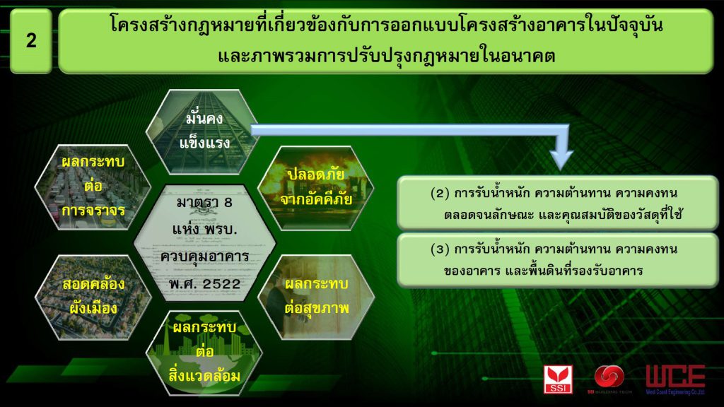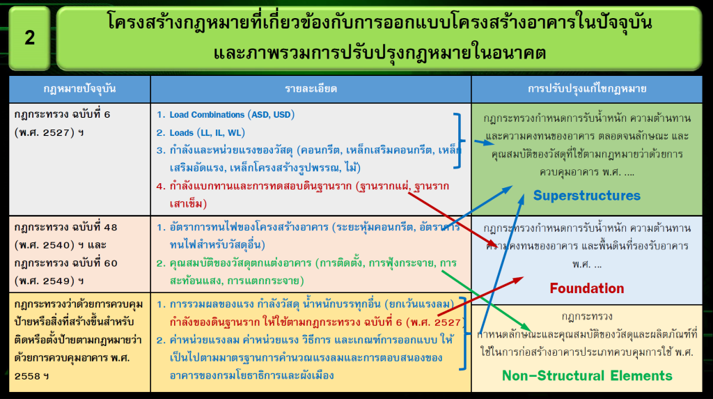 ที่กล่าวถึงว่ามีความสำคัญและควรให้ความสนใจ ด้วยเหตุผลที่ กรมโยธาธิการและผังเมืองจะดำเนินการ “ยกเลิก” กฎกระทรวงว่าด้วยงานออกแบบโครงสร้าง ตามความในพระราชบัญญัติควบคุมอาคาร ทั้งกฎกระทรวงฉบับที่ 6 ซึ่งว่าด้วยเรื่อง น้ำหนักบรรทุก (load) น้ำหนักบรรทุกรวม (load combination) กำลังวัสดุและฐานราก ฉบับที่ 48 และฉบับที่ 60 ซึ่งว่าด้วยเรื่องอัตราการทนไฟของโครงสร้างอาคาร และวัสดุตกแต่งอาคาร รวมไปจนถึงกฎกระทรวงที่ว่าด้วยเรื่องของการควบคุมป้าย โดยได้มีการปรับปรุงแก้ไขกฎกระทรวงทั้งหมดที่จะยกเลิกนี้และจัดทำเป็นกฎกระทรวงฉบับใหม่ขึ้นมา โดยอ้างอิงกับมาตรฐานและ building code ที่ใช้กันในระดับสากล ตลอดจนการสำรวจข้อมูลจากงานก่อสร้างภายในประเทศ