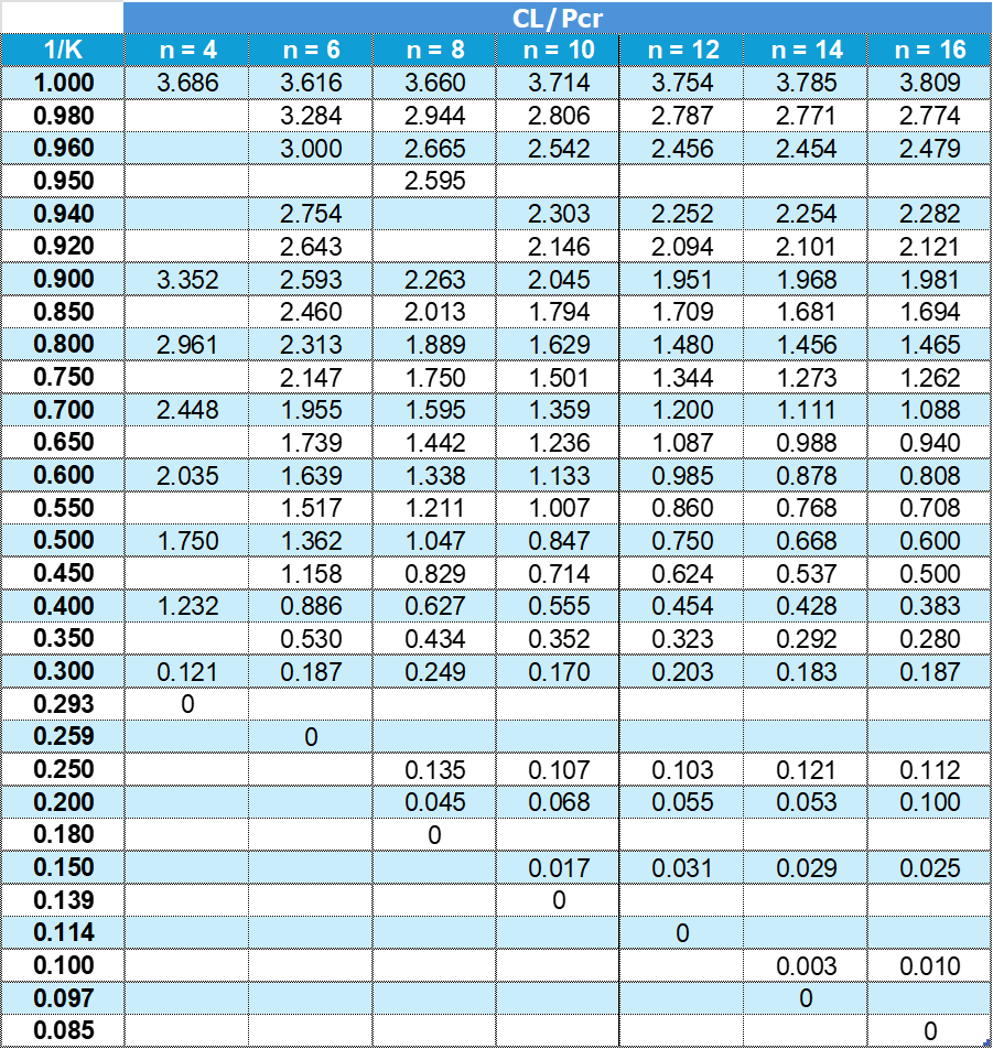 - นำค่า n และ Cl/Pcr ไปเปิดตารางเพื่อหาค่า 1/K ที่สอดคล้องกันสำหรับช่วงคอร์ดรับแรงอัด (Compression-chord panel) โดยให้ทำการเทียบบัญญัติไตรยางศ์ (Interpolate) ตามความจำเป็น