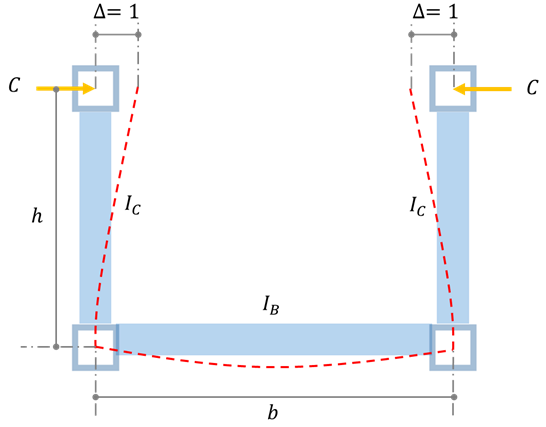 ในลำดับต่อไป จะกล่าวถึงขั้นตอนการออกแบบและการใช้งานของตารางดังกล่าว อย่างไรก็ตาม ก่อนเข้าสู่เนื้อหา จำเป็นต้องทำความเข้าใจค่า stiffness (C) ที่เกี่ยวข้องกับการเสียเสถียรภาพของสะพานที่พิจารณาก่อน จากภาพที่ 6 แสดงลักษณะการเสียรูปที่ใช้ในการประเมินค่า stiffness (C) ด้านเสถียรภาพ โดยในกรณีที่โครงสร้างส่วน top chord เสียรูปไปในทิศทางเดียวกัน จะทำให้ floor beam เกิดการเสียรูปแบบ double curvature ดังแสดงในภาพที่ 7ซึ่งกรณีดังกล่าวให้ค่า stiffness (C) สูงกว่า จึงไม่ใช่รูปแบบที่นำมาใช้ในการพิจารณาเสถียรภาพของสะพานแบบ Pony