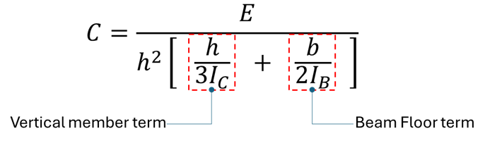 จากภาพที่ 6 ค่า spring constant (C) หรือ lateral stiffness ซึ่งต้านการเสียรูปด้านข้างของ top chord มีค่าเป็นไปตามที่แสดงในภาพที่ 7 โดยค่าดังกล่าวเป็นผลความสามารถต้านการเสียรูป (Stiffness) จากองค์ประกอบสองส่วน ได้แก่ floor beam และ vertical member ตามสมการที่แสดงในภาพที่ 8