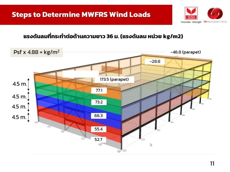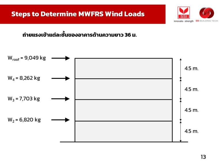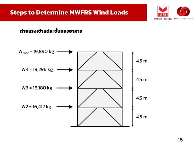 - ถ่ายแรงเข้าชั้นของอาคารโดยคูณความสูงและความยาวของด้านที่พิจารณา จากหน่วย (kg/m2 x m. x m.) ก็จะได้แรงลมที่เป็น point load ของชั้นนั้นๆ มา