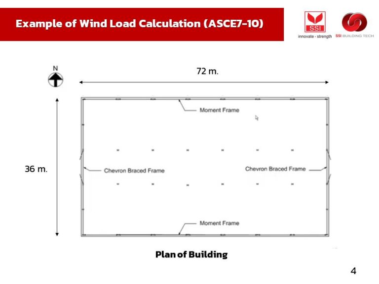 ซึ่งจากโจทย์ข้างต้น หากดู plan ในรูปที่ 4 จะเห็นว่า ระบบรับแรงทางด้านข้าง ถูกออกแบบไว้ที่ขอบของอาคารทั้งหมด และมี 2 ระบบด้วยกัน คือ (1.) chevron braced frame ในด้านกว้าง (36 เมตร) และ (2.) moment frame ในด้านยาว (72 เมตร) ดังนั้น จาก plan ดังกล่าว เราก็จะสรุปได้ว่า แรงทางด้านข้างจะถูกถ่ายเข้าระบบที่ 1 และ 2 เท่าๆ กันทั้ง 2 ด้าน (หาร 2 นั่นเอง)