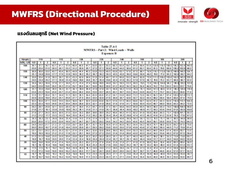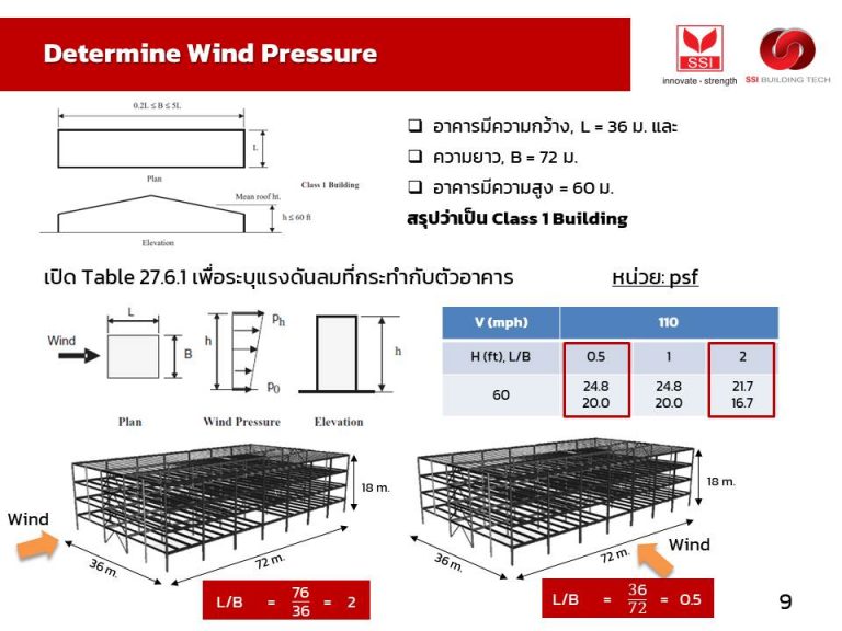 - กำหนดด้านที่พิจารณาของอาคารก่อน เช่น ลมเข้าด้านที่อาคารมีความยาว 36 เมตร ดังนั้น ค่า L ก็จะเท่ากับ 72 และ B เท่ากับ 36 ก็จะได้ L/B ratio = 2 และดูความสูงของอาคาร ในหน่วย ft. ก็จะได้ว่าอาคารนี้สูง 60 ft. (18 เมตร) โดยที่ความเร็วลมในหน่วย mile per hour (mph) นั้น มีความอยู่ที่ 110 (ดูวิธีการเปลี่ยนความเร็วลมได้ในรูปที่ 😎