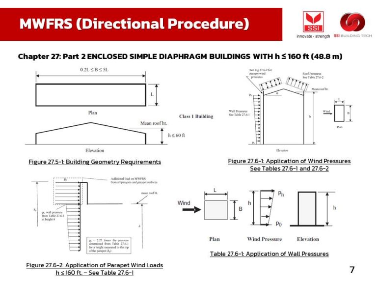 สำหรับ การคำนวณแรงลม ที่กระทำกับอาคารด้วยวิธี simplified directional procedure นั้น หากเปิด code ASCE 7-10 จะอยู่ใน chapter 27 part 2 โดยจะเริ่มที่เลขหัวข้อ 27.5 general requirements ส่วนการที่จะใช้การคำนวณแบบง่ายนั้น ตัว geometry ของอาคารจะต้องเข้าเกณฑ์ที่ code ได้ระบุไว้ก่อน ว่าเป็น อาคารแบบ class 1 หรือ class 2 (figure 27.5.1)