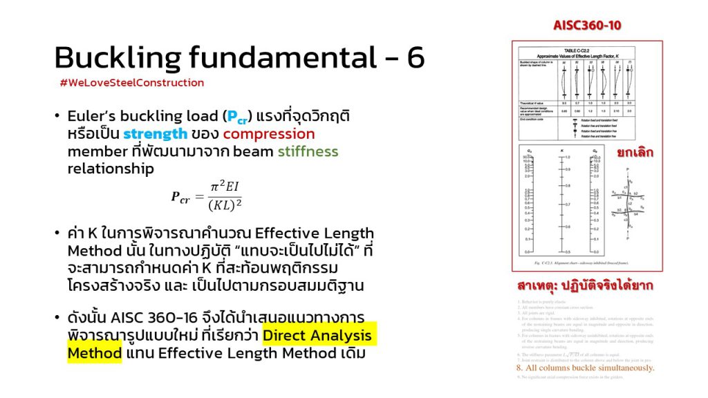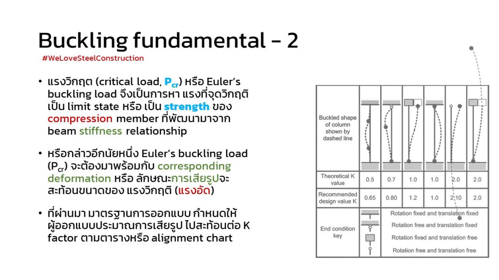 – การที่จะรู้ buckling strength (ทั้ง axial compression หรือ bending moment ก็ตาม) จะต้องรู้ deformed shape ซึ่งประมาณการด้วยค่า K factor