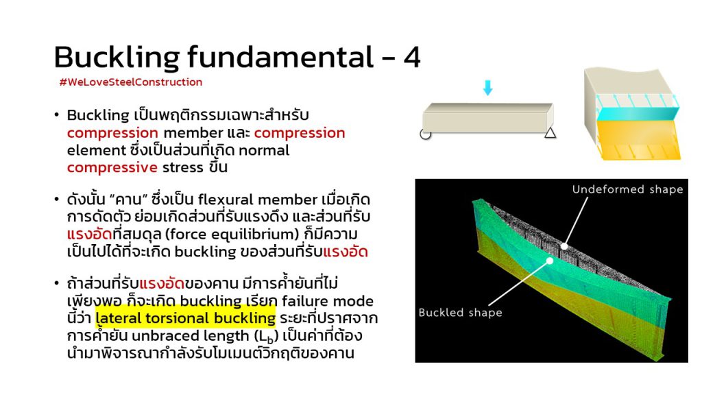 1) Compression zone ตามแนวยาวของคาน มีความชะลูดมากเกินไป (มีระยะห่างที่ปราศจากการค้ำยันทางข้าง หรือ lateral unbraced length, Lb มาก) ก็อาจเกิด buckling ที่เรียกว่า Lateral Torsional Buckling หรือ LTB