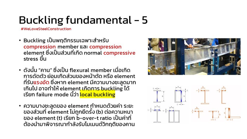 2) Compression element ที่บาง ผอมจนเกินไป (ปีกกว้างมากไป คานลึกมากไป ค่า b สูง b/t ratio สูง) ก็อาจเกิด buckling ที่เรียกว่า Local Buckling หรือ LB