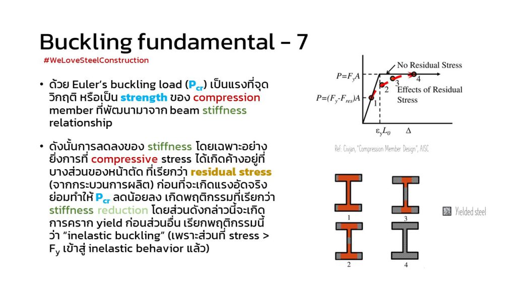 – ผลิตภัณฑ์เหล็ก เมื่อนำมาใช้งาน เป็นธรรมดาที่จะมี stress คงค้าง ที่หลงเหลือมาจากกระบวนการผลิต เรียกว่า “Residual stress ” โดยจะเกิดทั้ง compressive และ tensile residual stress อย่างสมดุลกัน ค่า residual stress นี้มีผลอย่างมากต่อการพิจารณา buckling strength ของทั้ง เสา และ คาน