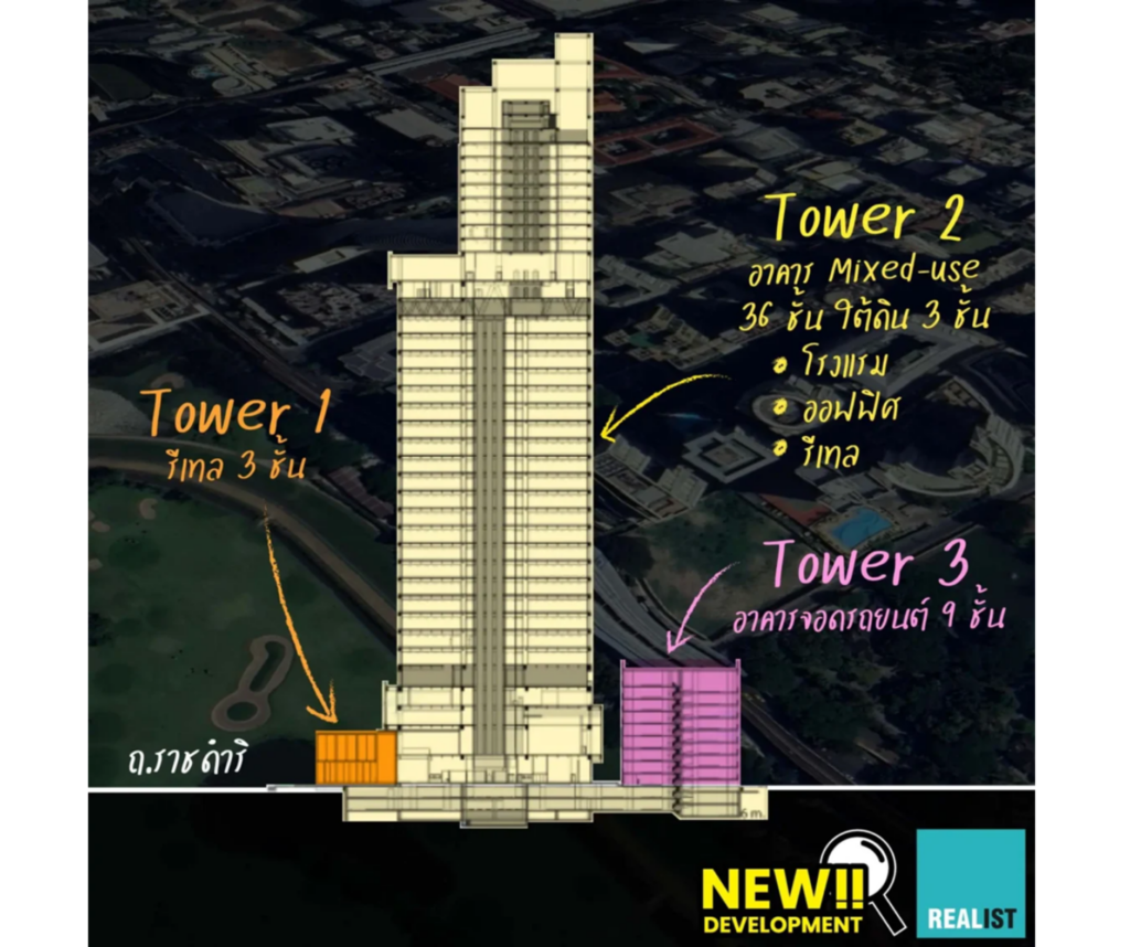 - Tower 1 (Retail): สูง 3 ชั้น เน้นพื้นที่เปิดโล่ง (Open Space) สำหรับพื้นที่การค้า ส่วนพาณิชยกรรม