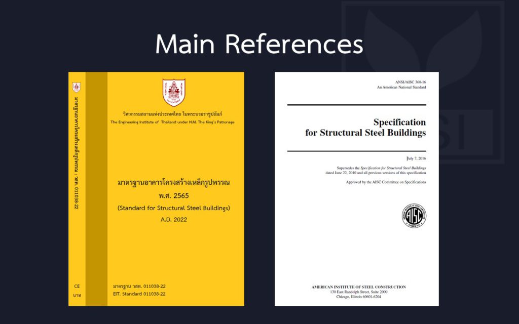 เนื้อหาส่วนนี้จะเป็นการนำเสนอพื้นฐานที่เกี่ยวข้อง ของงานสัมมนาที่จัดโดย กลุ่มอุตสาหกรรมเหล็กและเหล็กกล้า สภาอุตสาหกรรมแห่งประเทศไทย ในวันศุกร์ที่ 16 มิถุนายน ซึ่งจะอ้างอิงมาตรฐานการออกแบบโครงสร้างเหล็ก ของวิศวกรรมสถานแห่งประเทศไทยฉบับล่าสุดที่ออกเมื่อปลายปี 2022 ซึ่งมีมาตรฐานต้นแบบเป็น AISC 360-16 ซึ่งเป็นฉบับล่าสุดในช่วงที่ดำเนินการจัดทำมาตรฐาน