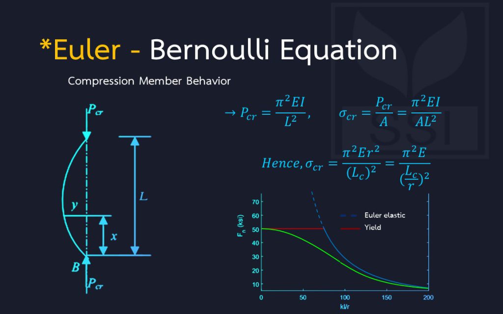 ย้อนกลับมาที่หลักในการคำนวณกำลังรับแรงอัด จริงๆ แล้วเราได้นำเสนอหลักในการพิจารณาวิเคราะห์ไปหลายตอน แต่อยากจะขอ recap สั้นๆ อีกครั้ง ว่า สมการหลักที่ใช้ในการคำนวณกำลังรับแรงอัด ยังเป็นสมการที่ Euler ได้พัฒนาขึ้น จากสมการ beam moment – curvature โดย Bernoulli ที่ได้กล่าวว่า moment ยิ่งมากยิ่งทำให้ curvature มาก ตามค่าคงที่ค่าหนึ่งที่เรียกว่า flexural stiffness หรือ EI หรือกล่าวได้ว่า Euler’s buckling load เป็นกำลัง (strength) ที่มีปัจจัยมาจาก flexural stiffness ของ member