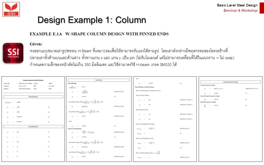 ท้ายตัวอย่างการคำนวณ จะแสดงวิธีการใช้ SSI Steel Design Mobile Application ในการคำนวณ ซึ่งสามารถให้ค่าได้อย่างรวดเร็ว เหมาะสำหรับ prelim design อย่างง่าย หรือใช้ในการตรวจสอบ finite element analysis program ที่ไม่ค่อยแสดงวิธีการคำนวณอย่างชัดเจน หรือจะ export รายการคำนวณออกมาเป็น pdf file เพื่อแนบขออนุญาตก่อสร้างได้อย่างสะดวกและรวดเร็ว
