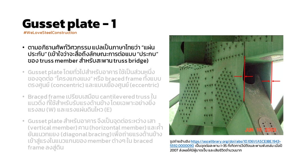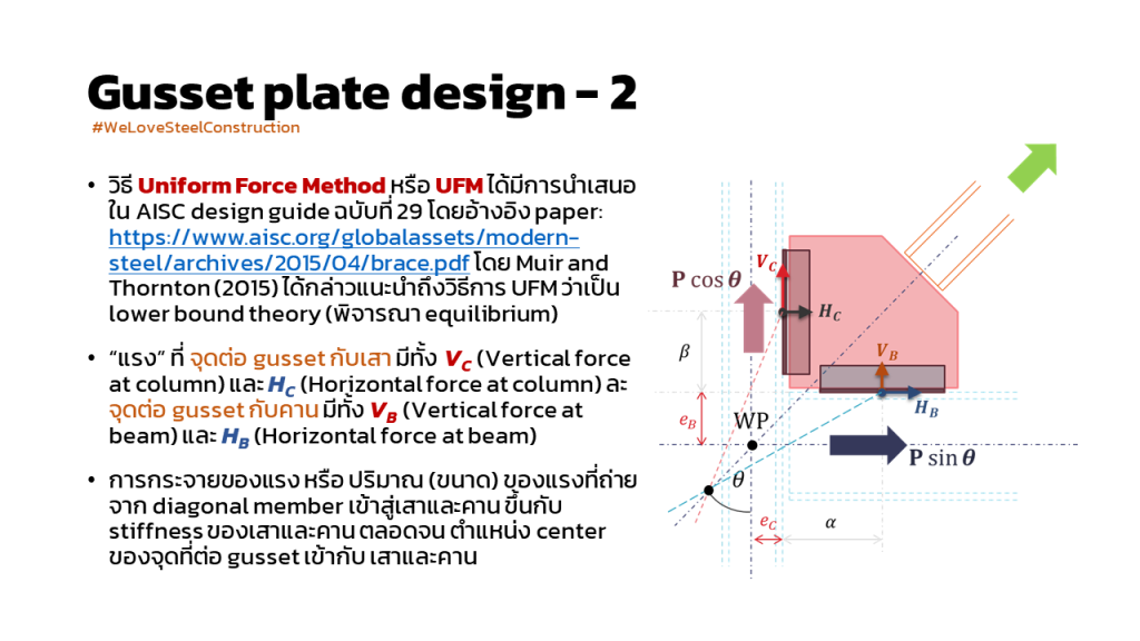 การคำนวณแรงเพื่อ ออกแบบ gusset plate connection : หัวข้อนี้เราอาจไม่ค่อยคุ้นเคยกันนักนะครับ เพราะบ้านเรา การออกแบบและการก่อสร้างระบบรับแรงด้านข้าง (lateral system) ของงานอาคารสูง (multi-story building) เกือบทั้งหมดเป็นระบบผนังคอนกรีตเสริมเหล็กรับแรงเฉือน หรือ reinforced concrete shear wall system แต่อย่างไรก็ดี เป็นประเด็นที่น่าสนใจ จึงขอนำมาฝากกันครับ