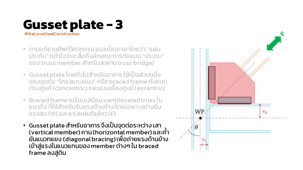 จุดต่อ gusset plate วิศวกรหลายๆ ท่านอาจไม่ได้ให้ความสำคัญมาก เพราะคิดว่าแรงมัน “ตรงศูนย์” อยู่แล้ว เราสามารถหาแรงที่กระทำกับ connection เพื่อไปคำนวณเทียบกับกำลัง ได้โดยการ แตก sine แตก cos ของแรงที่คำนวณได้ใน diagonal member แล้วก็เสร็จสิ้น ซึ่ง #ไม่ถูกต้อง นะครับ