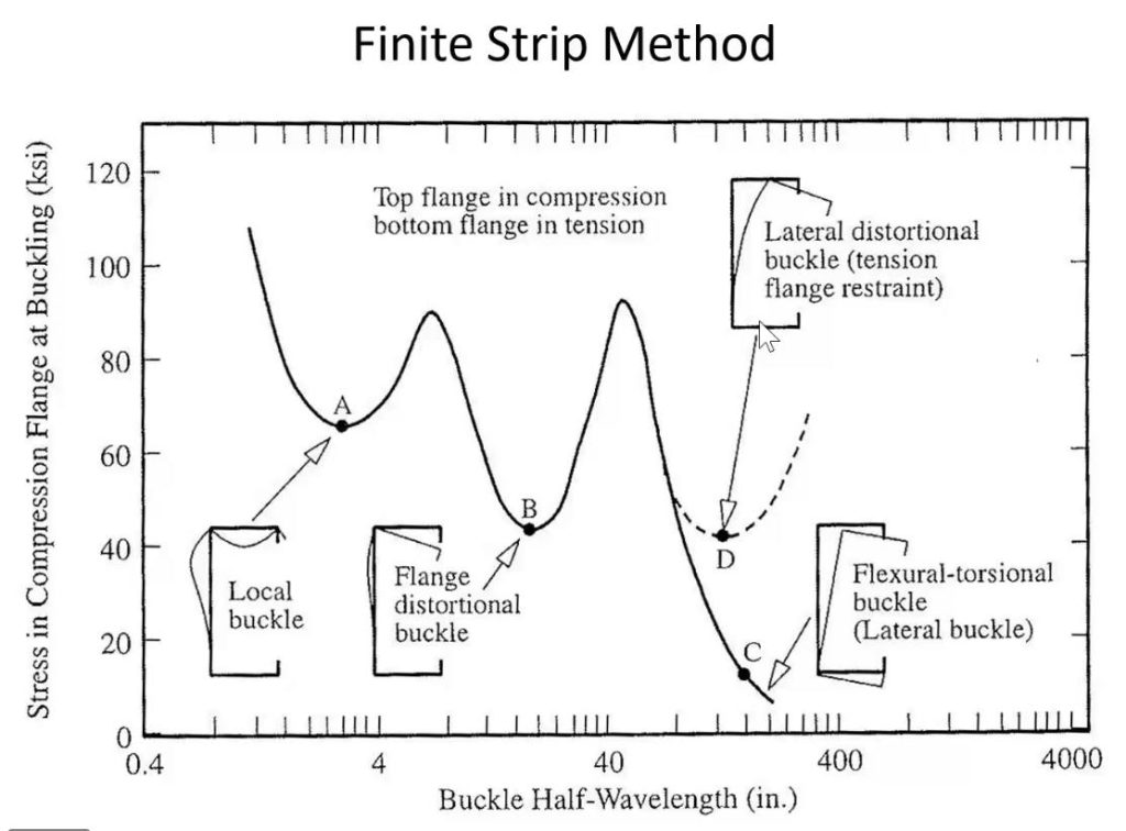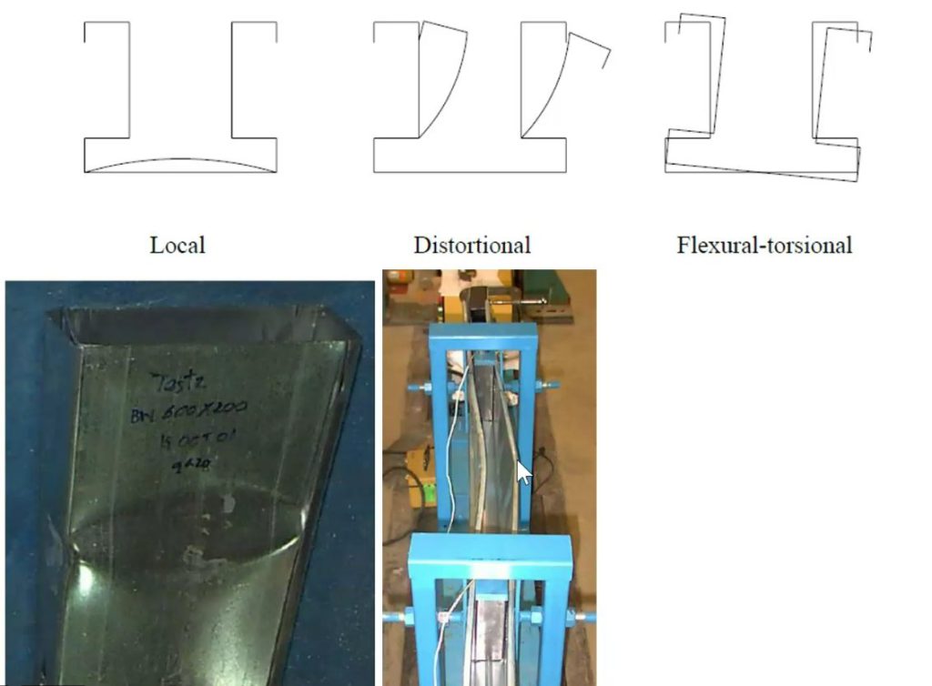รูปแบบการวิบัติ นอกจาก local buckling failure mode และ lateral torsional buckling failure mode ที่เป็นรูปแบบการวิบัติตามหลักการคำนวณโครงสร้างเหล็กทั่วไปแล้ว จากผลการวิเคราะห์ FSM ที่มีผลการทดสอบในห้องปฏิบัติการรองรับ จะพบว่ามีรูปแบบการวิบัติอีกรูปแบบ ที่เรียกว่า distortional buckling ที่มีลักษณะของการสูญเสียเสถียรภาพ ที่ “ระยะของการสูญเสียเสถียรภาพ ที่เรียกว่า half-sine wave length” จะอยู่ระหว่าง local buckling และ lateral torsional buckling
