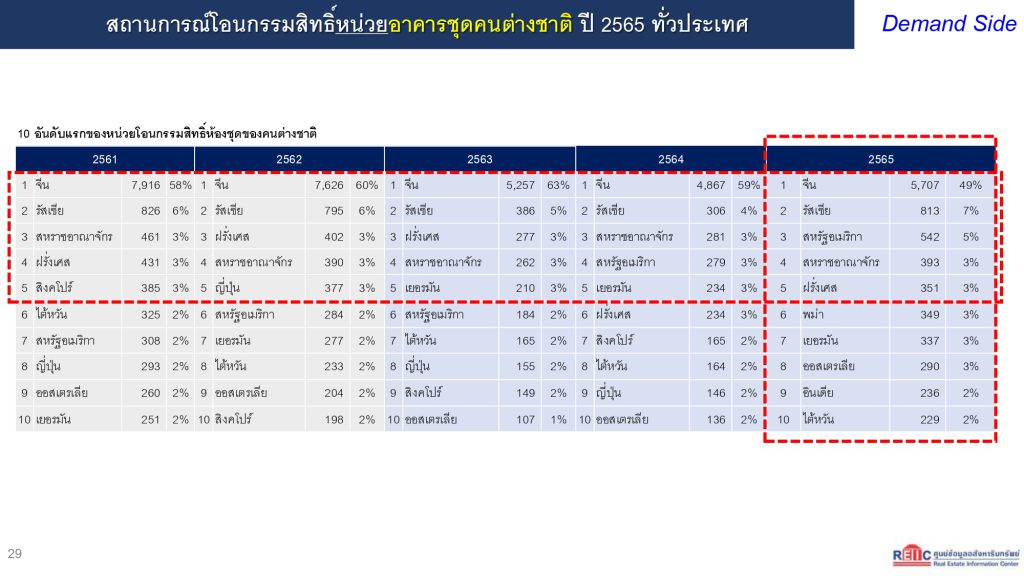 Dr. Wichai Wiratkaphan, the Inspector General and Acting Director of the Real Estate Information Center at the Government Housing Bank (GH Bank), stated that real estate and tourism play an important role in driving Thailand’s economy. In the past year (2022), it was found that there were a total of 11,561 units of foreign-owned condominiums transferred, an increase of 41%, with a total value of transfers amounting to 59.261 billion baht, an increase of 49.2%. Chinese nationals still remain the largest group of foreigners buying real estate in Thailand.