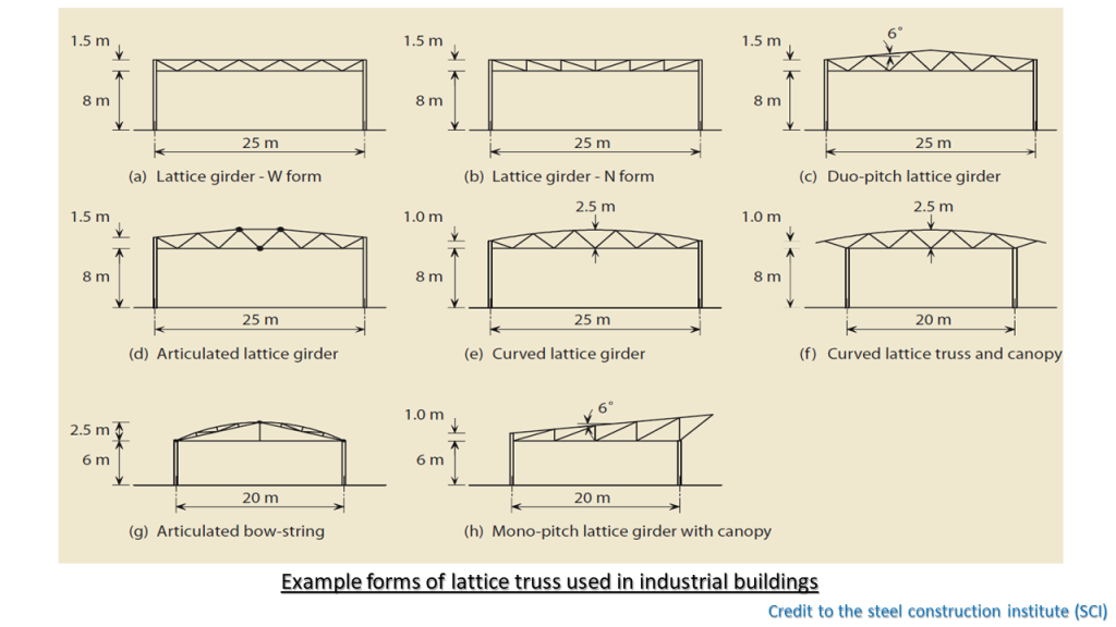 For long-span industrial buildings, lattice trusses using C, H, or O sections can be employed. Lattice trusses are typically beam and column structures and are less common in portal frames. Stability is primarily provided by bracing rather than rigid frame action in lattice trusses. Columns can also be constructed using lattice structures for in-plane stability. Lattice trusses offer high stiffness, load-bearing resistance, and material efficiency while enabling simple service integration.