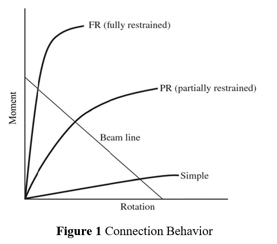 Even though they are referred to as moment connections, these connections are designed to transfer both shear and moment forces between the connected structural elements. Moment connections are classified as fully restrained (Type FR) or partially restrained (Type PR), based on their behavior. Fully restrained connections maintain zero relative rotation between members while transferring moment, whereas partially restrained connections allow for predictable relative rotation alongside moment transfer. Simple shear connections, on the other hand, rotate freely without transferring any moment. Real connection behavior may deviate from the ideal, as demonstrated by the moment-rotation curves in Fig 1.
